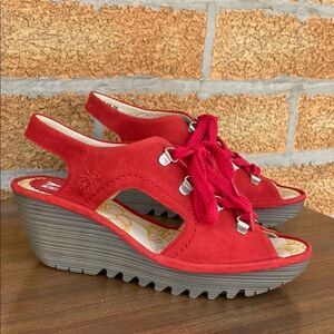 Fly London Ylfa Scarlet Red Leather Lace up Comfort Wedge Sandals size 8 new without a box
