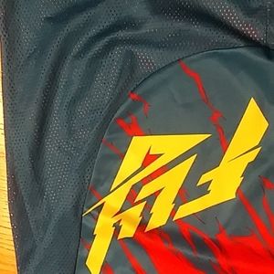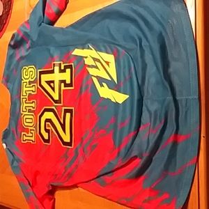 Jersey is an Adult size Large. Some small issues at the neck/shoulder, see photo. Has heat transfer rider name and number on back. These can be removed.