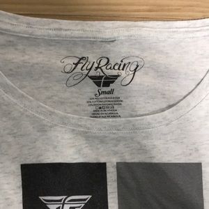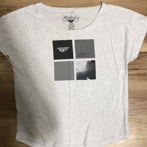 Soft material, and fun, brand name shirt. Can see some soft wear on the black and dark grey in the design, but it is subtle. Size small, fits somewhat loosely. Very comfortable casual tee.