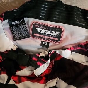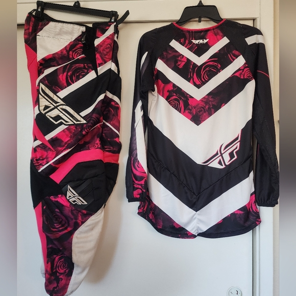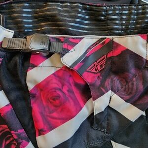 Fly Racing womens Small riding gear. Colors Black/White/Pink. Roses. Dirtbike riding gear. Used item. Some dirt stains visible.