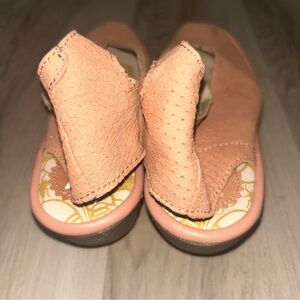 Experience the perfect blend of style and comfort with Frye's pink perforated leather mules. These shoes feature a breathable design with a textured pattern, making them ideal for warm weather. Their casual elegance and flat sole ensure all-day comfort.