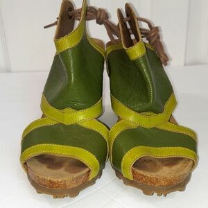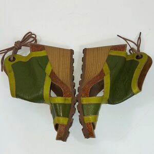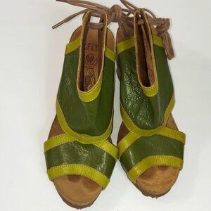 Fly London Luxe Kiwi & Olive Tieback Leather Platform Wedge Sandals Sz 36