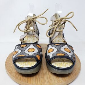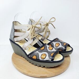 Fly London Yafi Wedge Sandals Womens 39 Silver Platform Wedge Lace Up Shoes