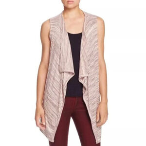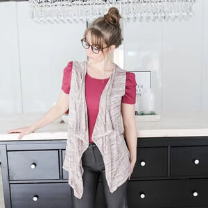 Natural tones in a horizontal stripe cascade the length of this open front flyaway vest. Center slit and peek a boo opening at back. Several available. Pants in other listings.