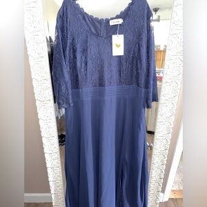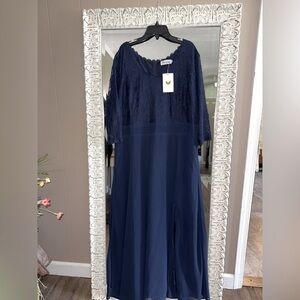 Flycurvy • Navy Scoop Neck Leg Slit Lace Top Maxi Dress