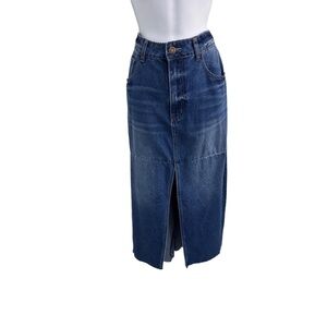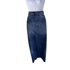 Never worn and freshly purchased this stylish skirt had tags removed but is still brand new. Unique front slit and maxi length make it a standout piece in any wardrobe. The blue denim pairs perfectly with everything for all seasons.