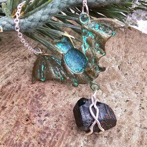 A unique metal flying bat pendant, handing down a nature tourmaline raw stone, it is wire wrapped with silver wire. It is stylish and beautiful flash of colors.