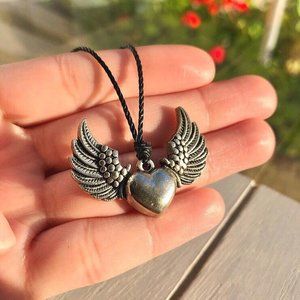 • Adjustable necklace ft. a dainty antique silver angel heart wing (approx. 1.5” wide) placed on a black waxed polyester cord. Finished w/ sliding knot closure.