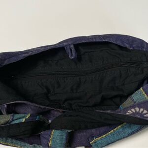 -16" x 14" Cotton with block print barrel bag. 2 front pockets, zipper pocket, cell pocket, zipper close - Hand Made in Nepal