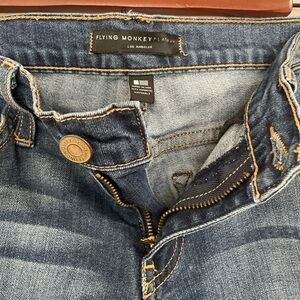 Dark blue denim with contrast stitching. Button closure. Classic style. Stretchy.