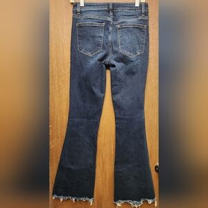 Stylish dark blue flare jeans. Perfect for a chic look. Comfortable and trendy.