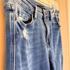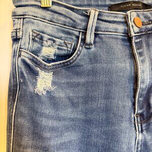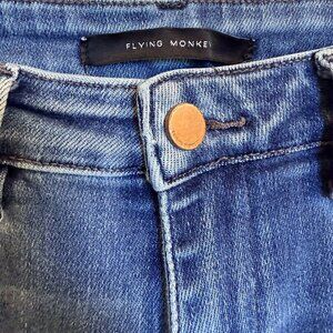 Stylish high-rise flare jeans by Flying Monkey in a medium blue wash with light distressing and raw hem. Stretch denim blend for a flattering, comfortable fit.