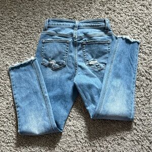 Stylish light blue cropped jeans. Features a frayed hem. Perfect for casual wear.