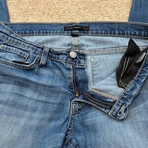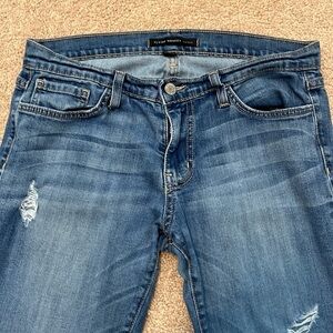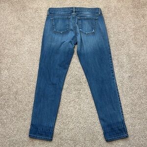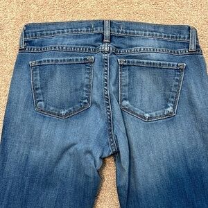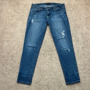 Flying Monkey Jeans - Skinny Style - Mid Rise - Distressed - Distressing Detail on Hems - Dark Wash - Size 26 - Good Stretch - Cotton, Rayon, Polyester & Spandex Blend - Good used condition with normal wear