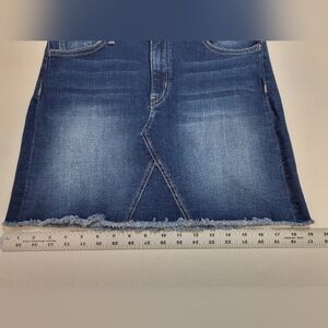 Flying Monkey Platinum High Rise fits above natural waistline hugs your hips for a sleek silhouette. Raw edge hem, zipper and button closure, like factory whiskering, classic 5 pocket, mini denim jean skirt.