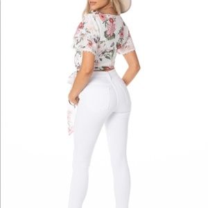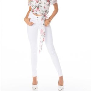 DETAILS: white denim, skinny leg, mid-rise, two faux front pockets, functional front coin pocket, functional back pockets, belt loops, front button & zipper closure