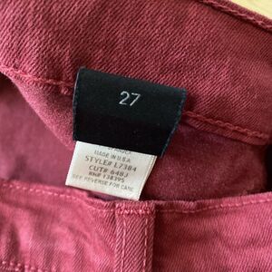 The Flying Monkey Women's 27 Stretch Skinny Jegging Jeans in Burgundy are pre-owned and made for women. These jeans are a size 27 and have a skinny fit. The brand is Flying Monkey and the model is Flying Monkey's 27. The style is skinny and the jeans feature stretch for added comfort.