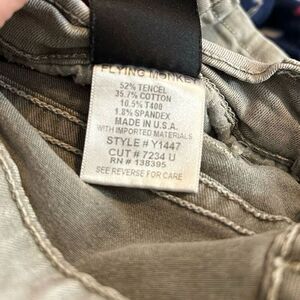 Flying Monkey skinny jeans in size 25 offer a slim fit with a mid-rise of 8.5-10.5 inches. These gray jeans feature a medium fabric wash with distressed accents and a 5-pocket design. Made from a blend of Tencel, cotton, polyester, and spandex, they provide stretch and softness for comfort. The inseam measures 30 inches, and they have a zip closure. Manufactured in the United States, these jeans are machine washable. Pre-owned condition. Measurements are shown in pictures.