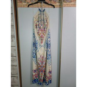 Halter style neck with tie in back. Keyhole front. Elastic upper hem in back. Rayon material. Chest 24"-32". Length 53". Flowy.