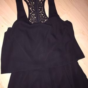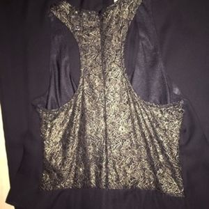 BLACK JUMPSUIT WITH OVERLAY IN FRONT AND METALLIC GOLD LACE AT BACK.