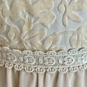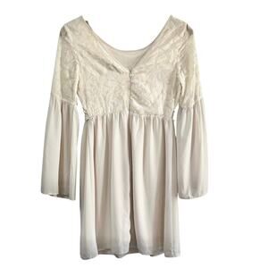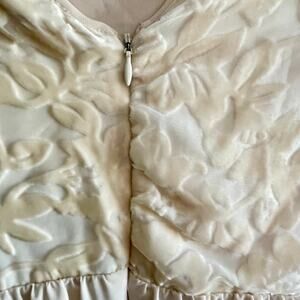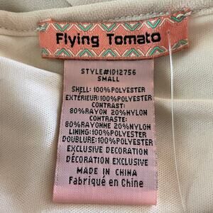 Flying Tomato Cream Babydoll Dress Velvet Embossed Flare Sleeves Size Small Fairy Angel. Bodice has embossed velvet floral motif. Lace trim at waist. Round neckline in front with v-neck back. Zip closure in back. Hemline above knees. New with tags.