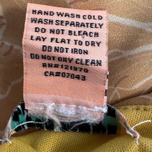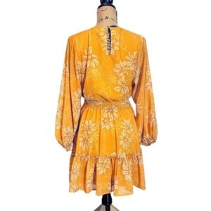 Orange dress with yellow flowers. Detachable belt. Long sleeve. Tiered skirt. Keyhole back. Elastic waist. Lined.