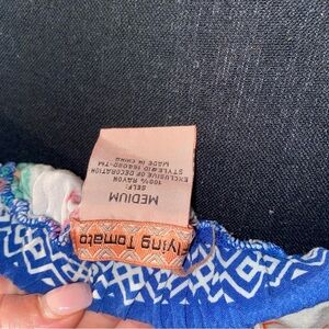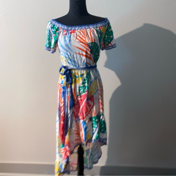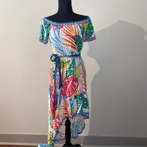 Step into a world of color with this Flying Tomato sundress, perfect for casual resort wear. The off-the-shoulder neckline and puff sleeves add a playful touch, while the high-low hemline ensures a stylish silhouette. Crafted in a vibrant blue and pink palette, this dress is a must-have for sunny adventures.