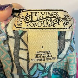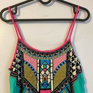 Flying Tomato Boho Geometric Aztec Design Multicolor Rayon Tank Top size L. Good preowned condition. Some elastic in top of back area. Adjustable straps. Bright vibrant colors. Fun all over design. See pictures for approximate measurements. Dress it up or down.