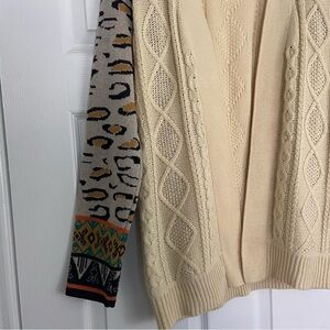 Flying Tomato Cardigan Sweater Ivory Aztec Tribal Leopard Mixed Print Open Sz L
