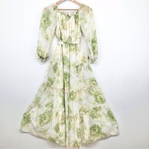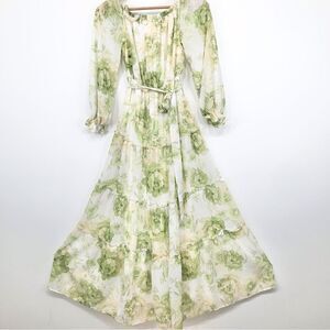 Flying Tomato Cream Green Floral Off Shoulder Flowy Tiered Belted Maxi Dress
