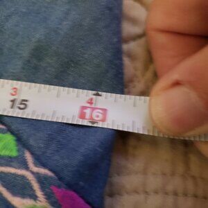 Flying Tomato Denim Embroidered Striped Maxi Dress - Aztec Chambray Embroidered Halter top with long Green/Pink polyester striped skirt. Elastic waist - Rope tie neck. Size Large. Measurements taken with the garment laying flat - 16" across the chest / 48" in length / 23" liner skirt.