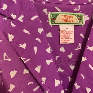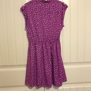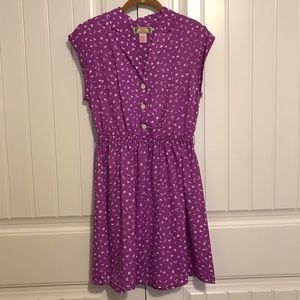 Purple dress with small pattern | pattern consists of hangers, dresses, hats & heels | hand wash only | bronze and cream button accents