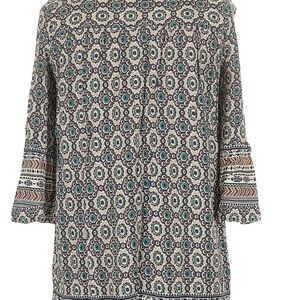 Chic tunic featuring geometric patterns. Accented with red and blue. Ideal for casual wear.