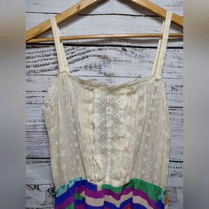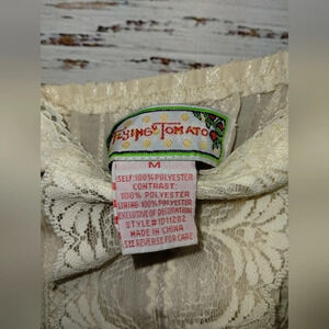 Flying Tomato Cream Lace & Multicolored Design High Low Dress size Women's Medium. Lace is a shimmery cream color and is semi sheer. Empire waist. Straps are fully adjustable. The bottom of the dress is high-low.