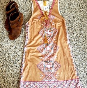 Size Small. NWT. Aztec, tribal print. Tie up detail in front. Zip up back. 100% Polyester. Soft faux suede. Measurements approx pit to pit 16". Shoulder to hem 32.5". Perfect festival dress