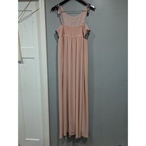 Flying Tomato Maxi Dress Peach Chiffon Embroidered Aztec Strapless Top Sz L. Please note there are a few spots on the peachy pink chiffon. I have attached pictures. A few are along the very bottom and are light and small. There is a lighter, but bigger spot on the center front. I have not attempted to clean them, so it is possible they can be removed. In my opinion, they are not too noticeable. There are also a few fabric snags and a few slight runs. There is still plenty of life left in the dress! All measurements are approximate.