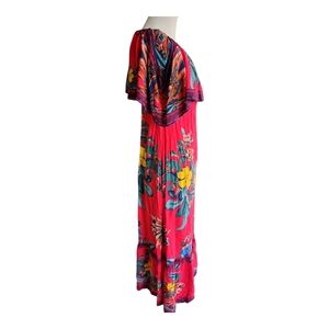 Add vibrant boho charm to your wardrobe with this stunning Flying Tomato off-shoulder maxi dress in size Small. Features a bold hot pink base with colorful tropical floral prints, flowy silhouette, and ruffle overlay neckline. Perfect for summer vacations, music festivals, or beach parties.
