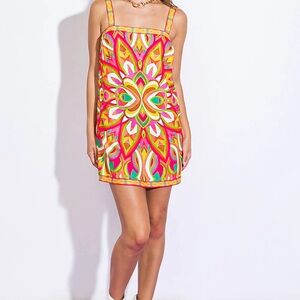 Embrace the vibrant spirit of summer with this Flying Tomato sundress, featuring a striking orange and pink geometric pattern. Designed with a spaghetti strap neckline and a sleeveless cut, this mini dress is perfect for a night out or a resort getaway. Its playful and artistic design ensures you stand out in any setting.