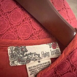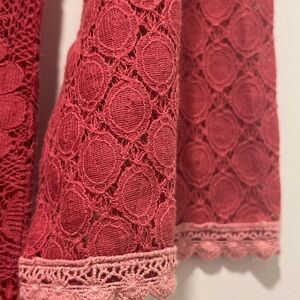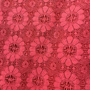 Chic red lace dress with floral pattern. Features long sleeves and delicate lace trim. Perfect for elegant events.