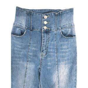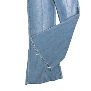 Flying Tomato Retro High Wide Waist 3 button Flare Jeans Raw Edge hem Light Wash