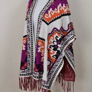 Flying Tomato Ruana sweater fringe poncho. Size S/M. Cream, purple, orange, and black oversize print.