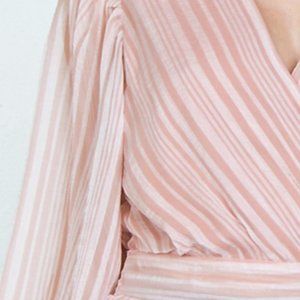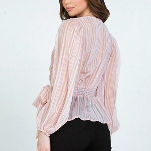 A woven top featuring surplice neckline, long peasant sleeves, flat front waist and smocked back waist, side tie and peplum