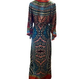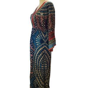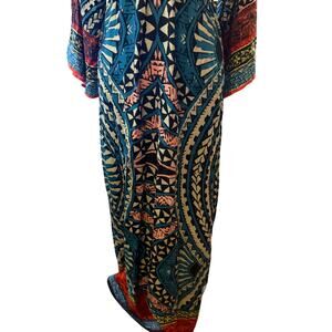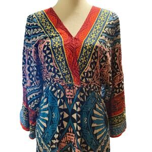 Flying Tomato Tribal Print V-Neck Maxi Dress, Multicolor, 100% Rayon, Medium. Make a bold style statement with this stunning multicolor tribal print maxi dress. Featuring a v-neckline, wide long sleeves, and a relaxed silhouette, this piece is both striking and comfortable. The vibrant pattern blends coral, turquoise, yellow and navy tones in an inspired motif. Elasticized waist for a flattering fit and flowy feel. Retails for $88, excellent condition.