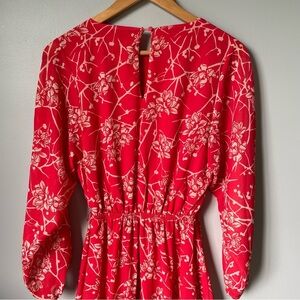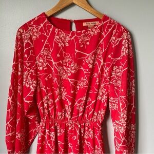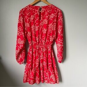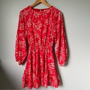 This stunning red sundress features a smocked waist and bishop sleeves, offering a flattering and elegant silhouette. The crew neck and airy fabric make it perfect for a wedding guest or cocktail event. Its vibrant color and flowy design add a touch of romance to any occasion. Size XS. Like new!