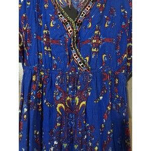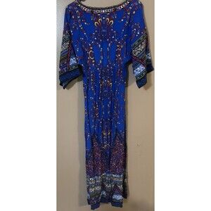 The Flying Tomato Women's V Neck Dress in size Medium is a stunning maxi dress perfect for festivals and Bohemian-themed events. Featuring a geometric blue pattern with embroidered accents, this pullover dress has a flattering V-neckline and kimono sleeves. Made from lightweight rayon fabric, it is ideal for casual outings, parties, and even traveling during the warmer seasons of summer, fall, and spring. This dress is a stylish and comfortable choice for any fashionable woman looking to make a statement with their outfit.