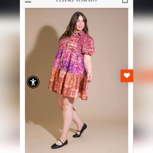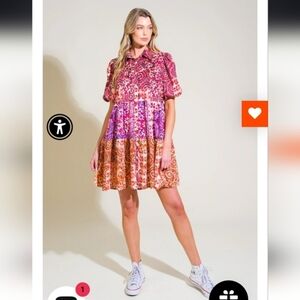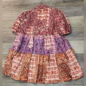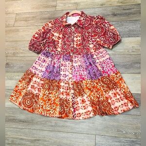 Flying Tomato Keep It Interesting Woven Minidress Colorful Floral Patchwork Dress Size Large. New without tags. Vibrant dress with floral patchwork design. Features red, pink, purple, and orange patterns. Shirt collar button down tiered dress. I'm a highly rated fast shipper.