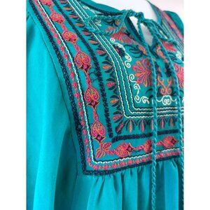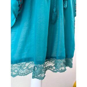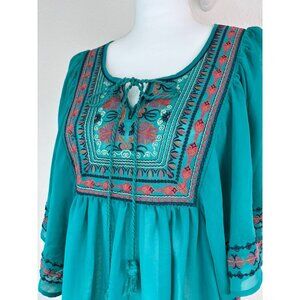 Flying Tomato brand women's size medium teal green embroidered peasant blouse. In good pre-owned condition. Lightweight semi sheer material has a great flow. Lace detail along hemline. Bodice is covered in a beautiful embroidered patterned. Short flutter sleeves with embroidered detail.