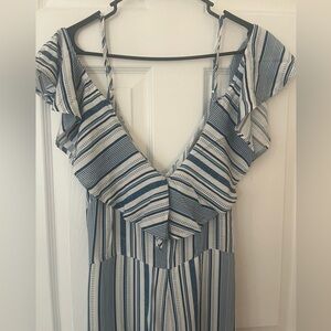 Flying Tomato women’s size M blue/white ruffle off the shoulder jumpsuit