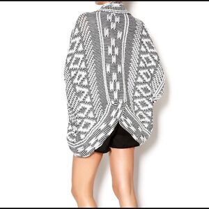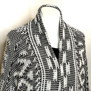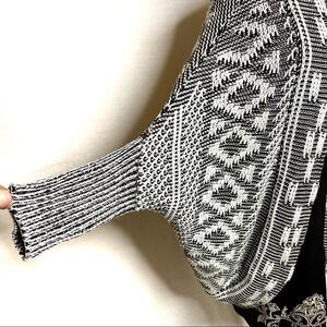 Flying Tomato black and white open front woven cardigan size S/M. Chunky knit. Rounded back. Split bottom. Dolman sleeves with ribbed sleeve cuffs. 100% acrylic. Hand wash. Length 34” from shoulder to longest point in the front.