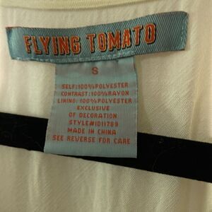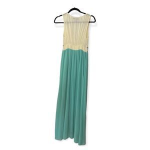 Flying Tomato embroidered maxi dress. Cream background on top with vibrant yellow blue and orange embroidery. Bottom is a turquoise blue